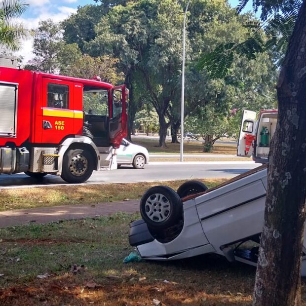 O Corpo de Bombeiros Militar do Distrito Federal (CBMDF) foi acionado às 10h52 e enviou três viaturas para atender à ocorrência. No local, os bombeiros encontraram um Fiat Fiorino branco capotado, apoiado pelo teto às margens da via.