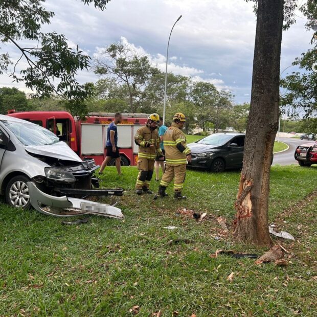 Ao chegarem, os socorristas encontraram um veículo VW Fox, de cor prata, que havia colidido contra uma árvore na área verde. As equipes iniciaram imediatamente os protocolos de atendimento a vítimas de trauma.