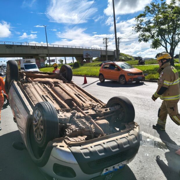 No local, as equipes encontraram um Fiat Mobi, de cor cinza, capotado sobre o teto ao longo da via pública. A vítima já estava fora do veículo no momento da chegada dos bombeiros.