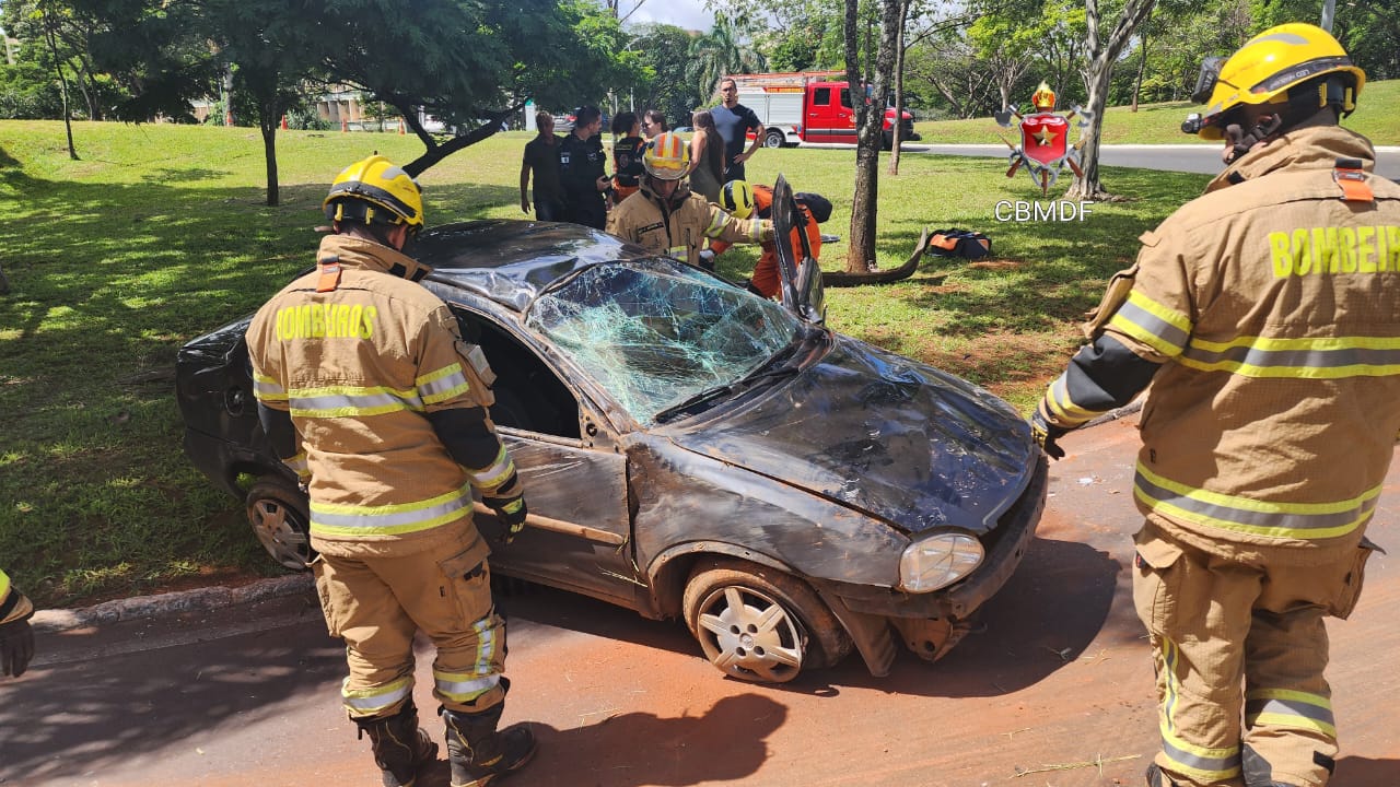 Na manhã desta segunda-feira (23), o Corpo de Bombeiros Militar do Distrito Federal (CBMDF) atendeu o capotamento de um veículo em uma tesourinha na 205/206 Sul.