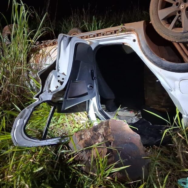 Ao chegarem ao local, os bombeiros encontraram um Renault Sandero branco que havia acabado de capotar e permanecia apoiado sobre o teto, às margens da rodovia. As equipes realizaram a segurança da cena, estabilizaram o veículo e adotaram medidas preventivas para evitar incêndio.