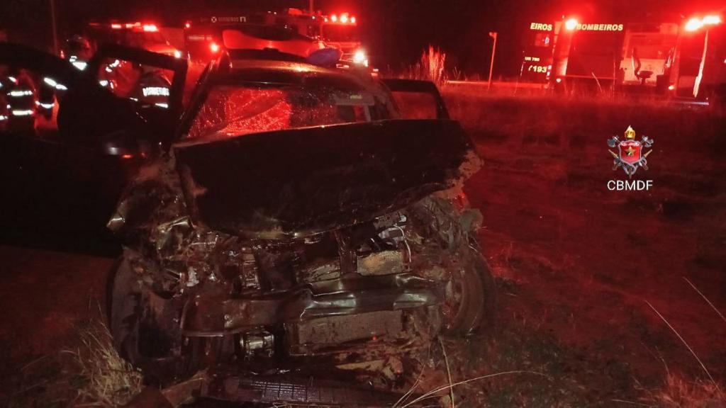 Ao chegarem no local, os bombeiros se depararam com um Renault Duster de cor verde, conduzido pelo senhor R.W.S.A., 39 anos, perdeu o controle da direção, saiu da via e capotou na marginal da pista sentido Planaltina, ele estava acompanhado da senhora A.L.T.A., 40 anos.