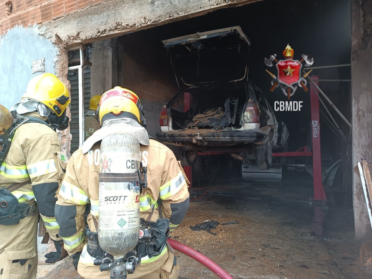 Um carro pegou fogo, no final da manhã desta segunda-feira (23), no Arapoanga, em Planaltina, em uma oficina.