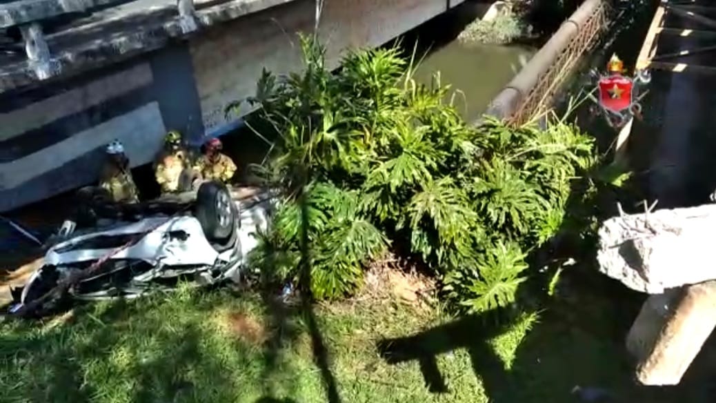 Na manhã desta quinta-feira (3), um veículo de passeio capotou na QI 17 do Lago Sul. A motorista, que estava sozinha no automóvel, perdeu o controle do carro, que atravessou a ponte do Ribeirão do Gama, destruindo a proteção e parando na beira da água.