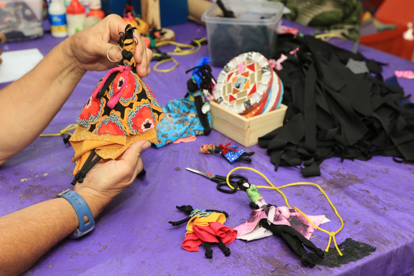 Fundada em 2006, a Oficina de Mosaico já atendeu mais de 1.500 pacientes que, junto ao tratamento, tornaram-se artesãos ao longo desses 17 anos. Hoje, a oficina possui 25 alunos ativos, coordenados pelas servidoras do Caps II do Riacho Fundo Cássia Maria da Silva Garcia e Maria Angélica Raguzzoni. Além do mosaico elaborado com restos de ferramentas, vidros, cerâmicas, madeiras, botões e até casca de ovo, os participantes aprendem a técnica da boneca Abayomi. Ela é feita com pedaços de malha, sem costura alguma, apenas nós ou tranças.