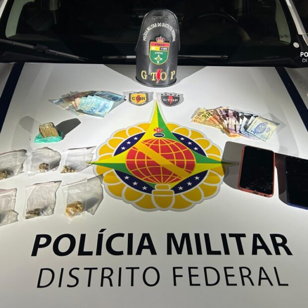 Durante a abordagem, os policiais encontraram porções de maconha e crack prontas para venda. Além das drogas, a PMDF apreendeu R$ 567,00 em espécie e um celular, que foi identificado como produto de furto.