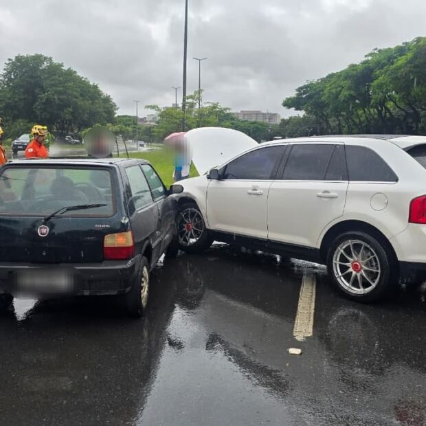 De acordo com o Corpo de Bombeiros Militar do Distrito Federal, duas viaturas foram empregadas no atendimento à ocorrência. No local, as equipes encontraram uma colisão entre um Fiat Uno, de cor verde, e um Ford Edge, de cor branca.