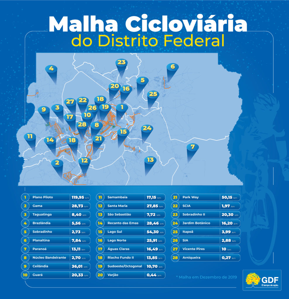 O Governo do Distrito Federal (GDF), por meio da Secretaria de Transporte e Mobilidade, prepara a expansão e a integração das ciclovias da capital. Desde o início de 2019, o conjunto de pistas exclusivas para bicicletas, skates e outros meios de locomoção não motorizados teve um aumento de 20% em sua extensão, saltando de 466,6 quilômetros, no final de 2018, para 553,95 quilômetros em julho de 2020. Esse número deixa o Distrito Federal com a maior malha cicloviária do Brasil.