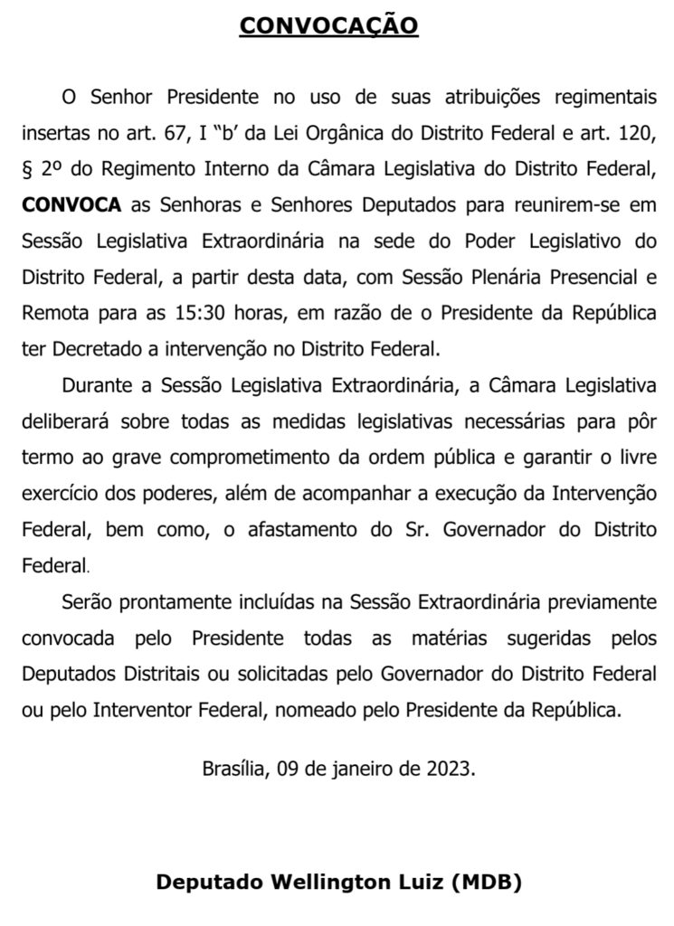A Câmara Legislativa do Distrito Federal (CLDF) irá realizar, nesta segunda-feira (09), uma sessão extraordinária para debater os atos antidemocráticos e de vandalismo que aconteceram ontem na Praça dos Três Poderes.