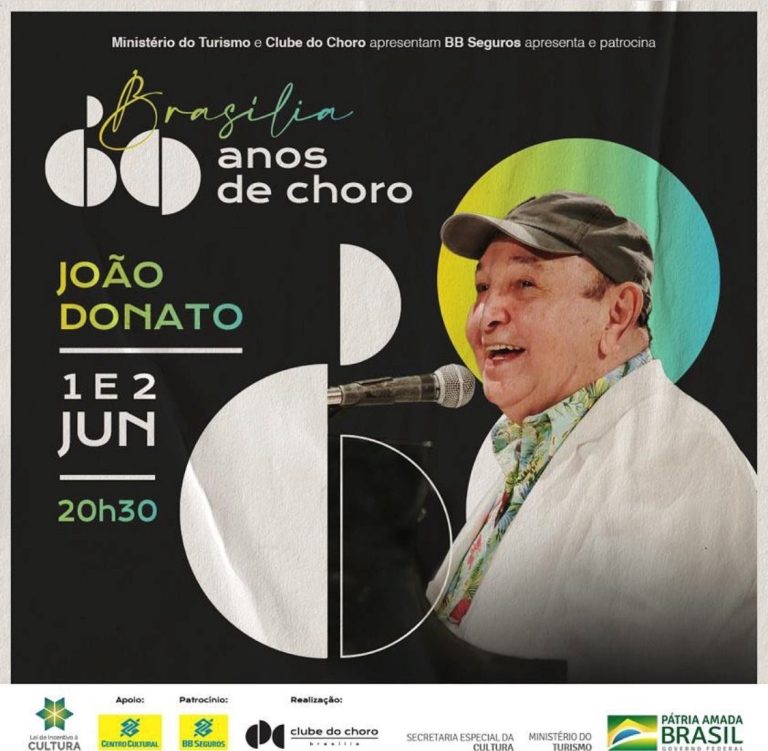 Uma apresentação do cantor e compositor, João Donato e seu trio, nos dias 1º e 2 de junho, às 20h30, marca a reinauguração do auditório do Clube de Choro Brasília, após dois anos fechado, por conta de restrições impostas pela pandemia. O novo projeto Brasília – 60 Anos de Choro, comemora as 6 décadas da capital, sede da primeira escola de choro do Brasil.
