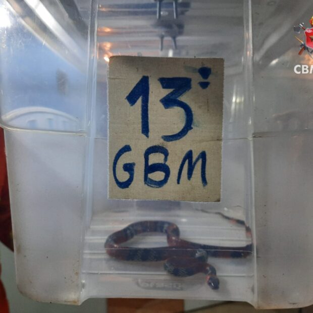 Ao chegar ao local, a equipe confirmou que se tratava de uma cobra coral. Utilizando equipamentos específicos para esse tipo de manejo, os militares realizaram a contenção e o resgate do animal de forma segura. Próximo ao ponto da ocorrência havia uma área de preservação permanente com mata densa, onde a serpente foi devolvida ao ambiente natural.