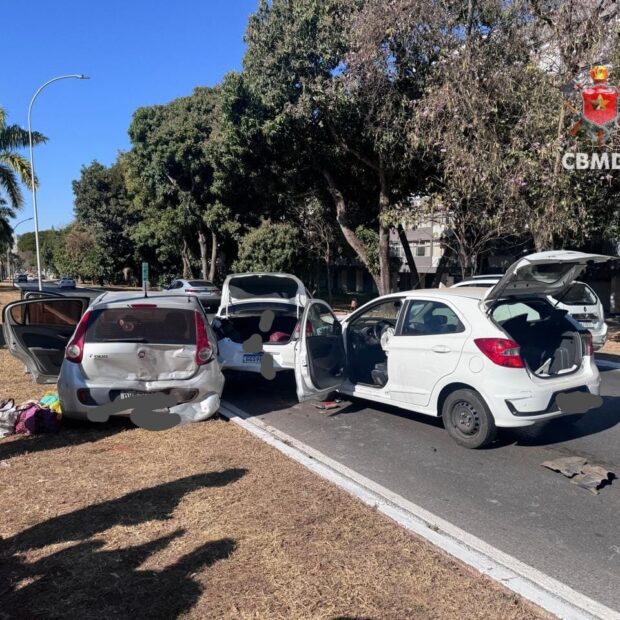 No local, as equipes encontraram três veículos envolvidos na colisão: um Ford Ka branco, conduzido por um homem de 32 anos; um Fiat Palio prata, dirigido por uma mulher de 40 anos; e um Toyota Etios, cujo motorista tem 44 anos.
