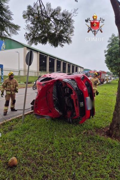 Ao chegarem ao local, os bombeiros encontraram um Fiat Argo vermelho no canteiro central da via, lateralizado, após ter colidido e capotado com um GM Corsa verde. Durante a triagem seguindo o protocolo de trauma, apenas o motorista do Argo, que estava consciente e orientado, relatou dores no corpo e precisou ser levado ao hospital. O condutor do outro veículo não precisou de transporte.