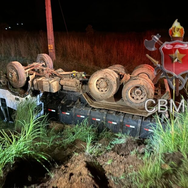 Uma colisão seguida de tombamento envolvendo um caminhão e uma moto na BR 070 resultou em duas vítimas sendo transportadas ao hospital.