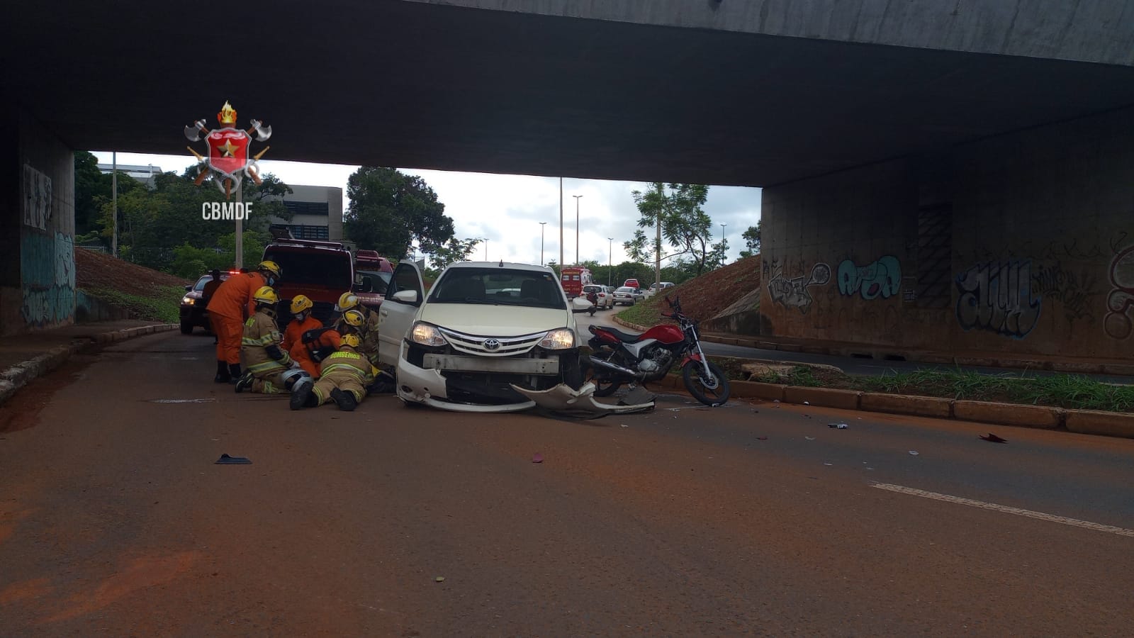 O acidente aconteceu nesta terça-feira (28) em baixo do viaduto do início da L2 Sul, a pista que dá acesso ao setor de autarquias. O Corpo de Bombeiros (CBMDF) foi até o local.