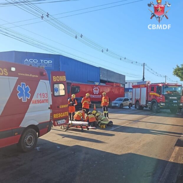 O Corpo de Bombeiros Militar do Distrito Federal foi acionado às 7h14 e deslocou duas viaturas até a QNO 20, no Setor O. Ao chegarem ao local, os militares encontraram uma batida envolvendo uma motocicleta Honda CG vermelha e um GM Classic preto.