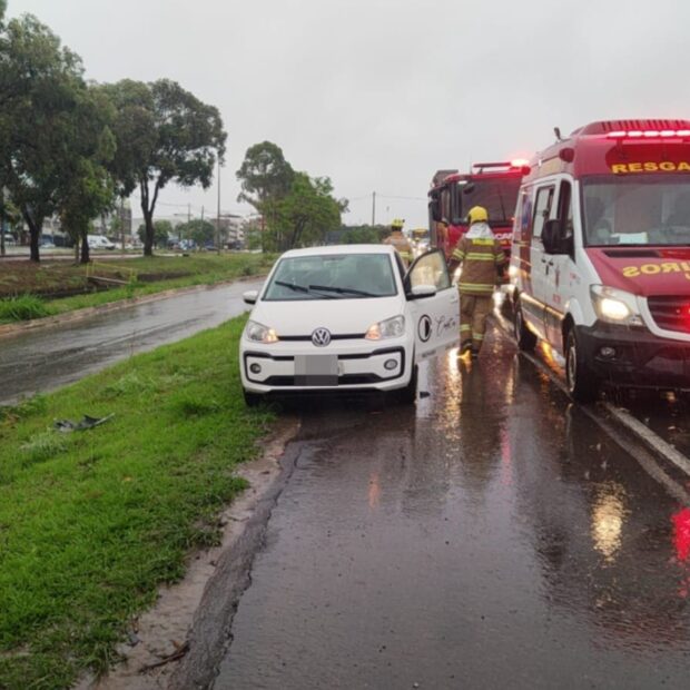 Ao chegarem ao local, as equipes encontraram múltiplos veículos acidentados, entre eles um VW Up branco, cuja condutora precisou de atendimento médico. A mulher estava consciente e orientada e foi transportada a uma unidade hospitalar.