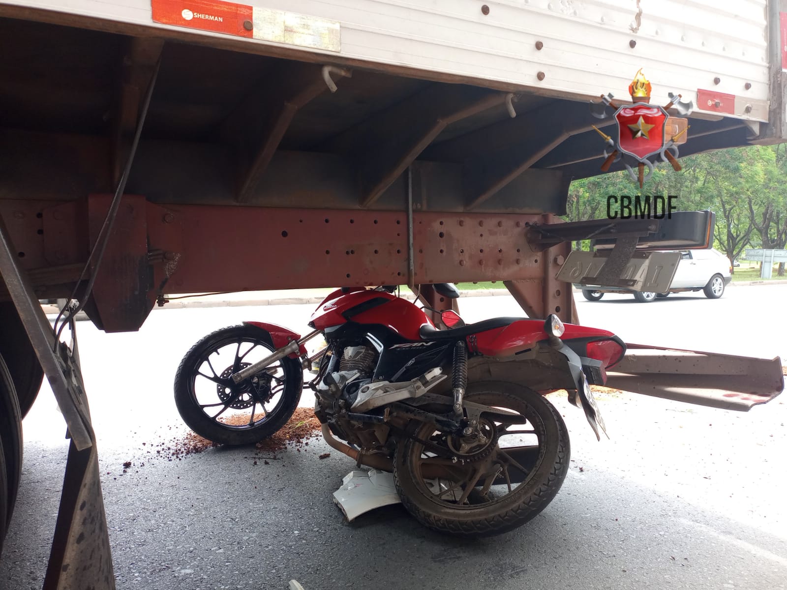 Uma colisão envolvendo uma motocicleta, um carro e um caminhão resultou em um motociclista ferido na manhã desta terça-feira na EPIA Sul, em frente ao Atacadão Dia a Dia, próximo à Octogonal, no sentido Sobradinho-DF.