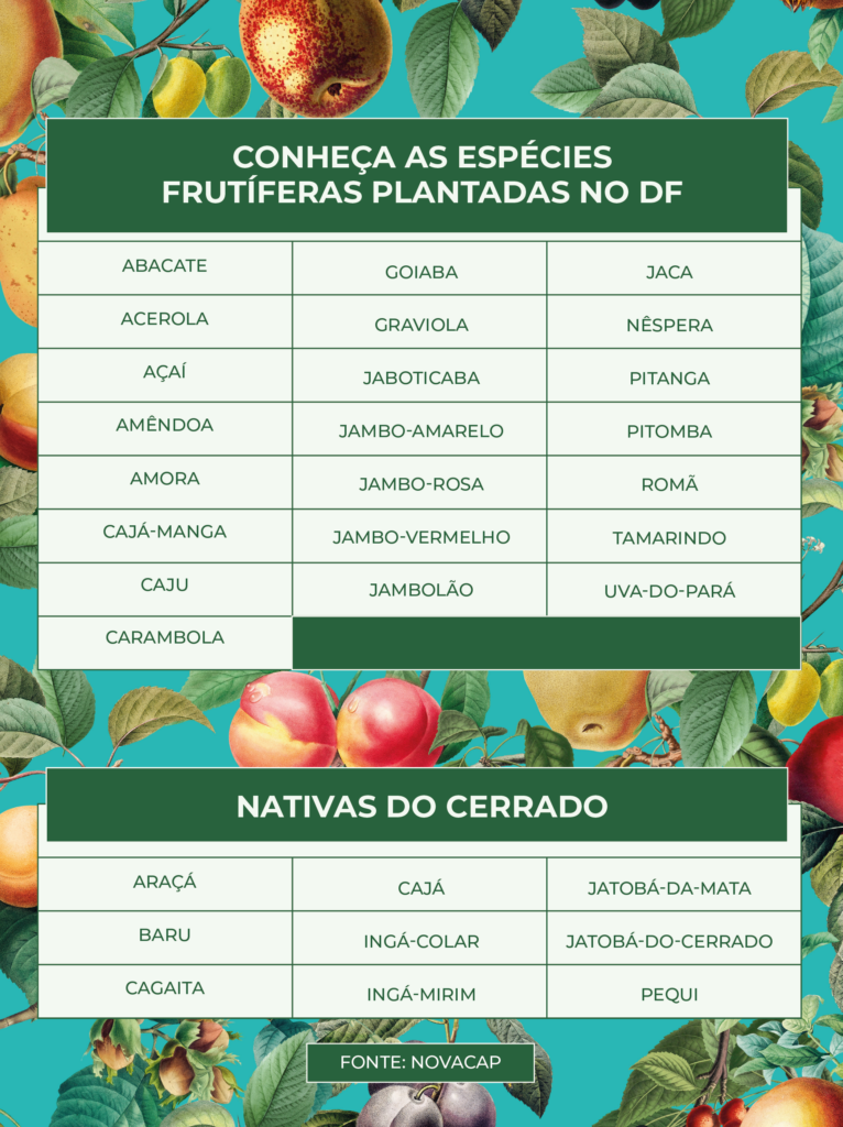 Um pomar a céu aberto. Assim a capital federal pode ser definida. São 950 mil árvores frutíferas de 35 espécies plantadas pela Companhia Urbanizadora da Nova Capital (Novacap) por todo o Distrito Federal. A plantação segue o plano de arborização originalmente previsto no relatório do urbanista Lucio Costa.