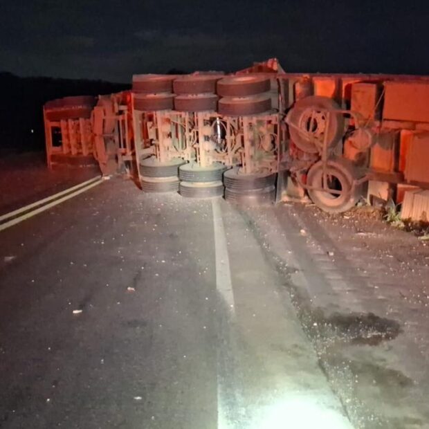 No local, as equipes encontraram uma carreta preta tombada, bloqueando completamente a via. O condutor, um homem adulto, estava preso às ferragens.