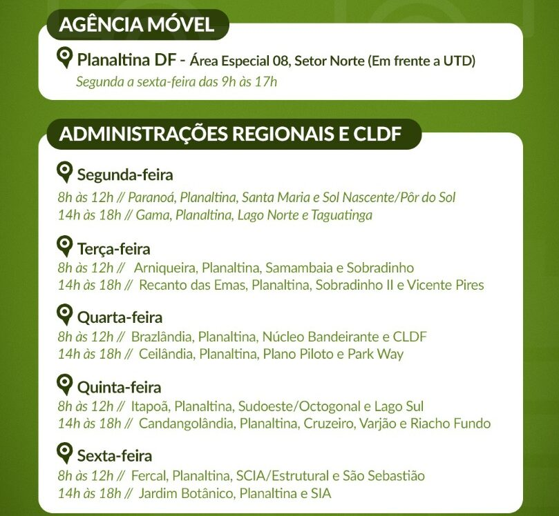 Seguem em funcionamento os postos instalados nas administrações regionais – Paranoá, Planaltina, São Sebastião, Taguatinga, Samambaia e Lago Sul – e as sete unidades do Na Hora.