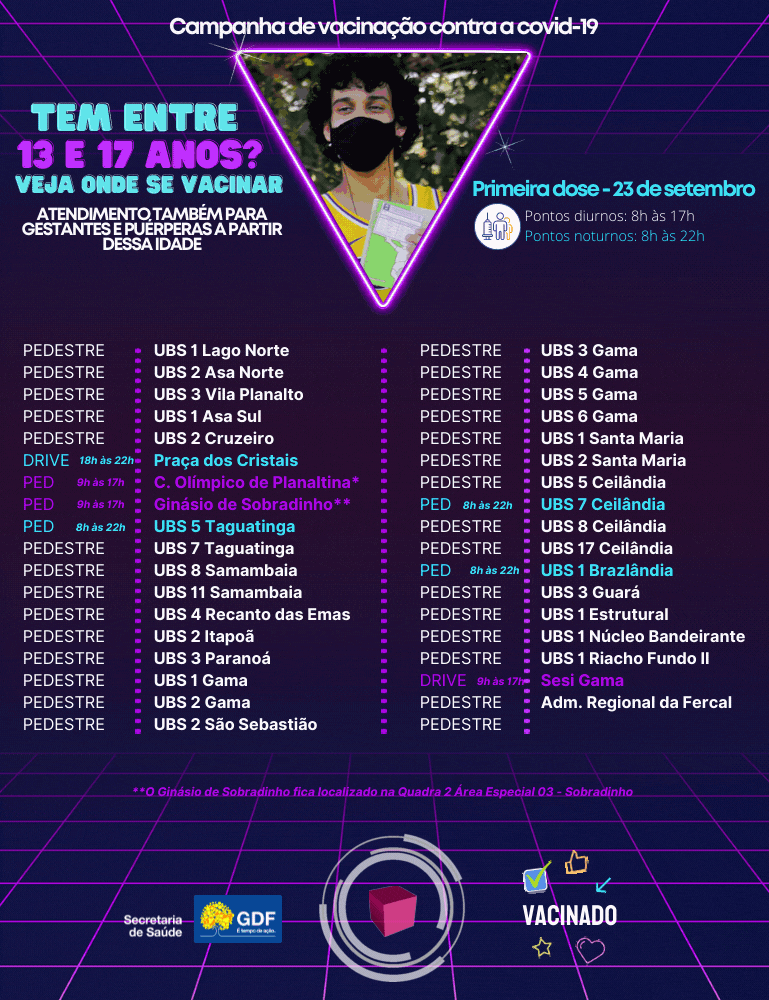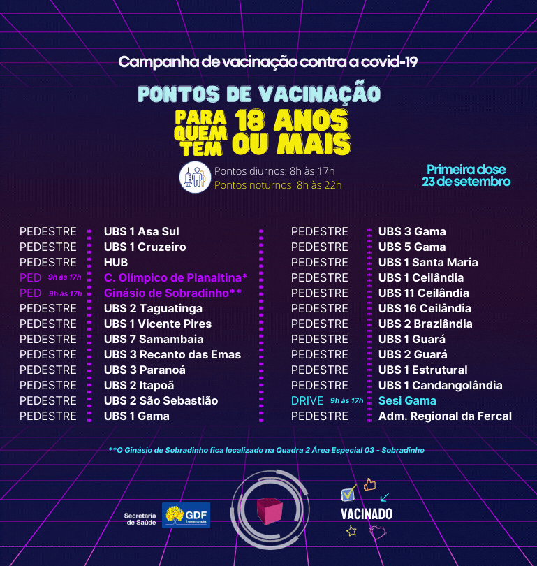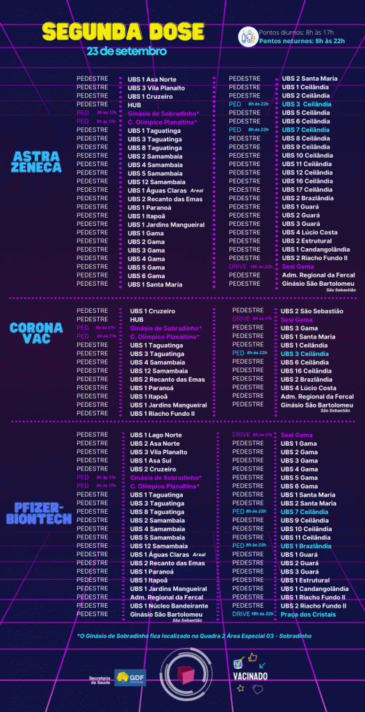 Com pouco mais de três milhões de vacinados e com a vacinação da dose de reforço para idosos liberada, o Governo do Distrito Federal (GDF) anunciou os pontos de aplicação da vacina nesta quinta-feira (23). Confira: