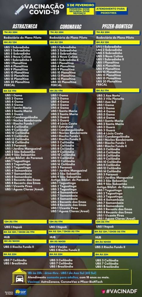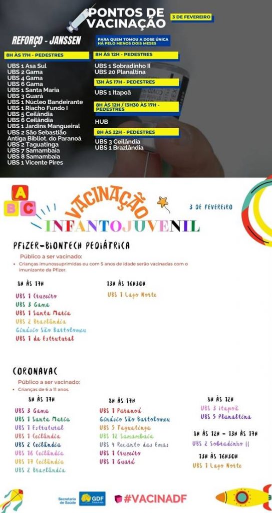 Nesta quinta-feira (3), o Distrito Federal contará com alguns postos de vacinação contra a covid-19. Crianças, adolescentes e adultos do Distrito Federal podem tomar a D1, D2 ou a dose de reforço. A aplicação de cada uma delas ocorre em locais específicos.