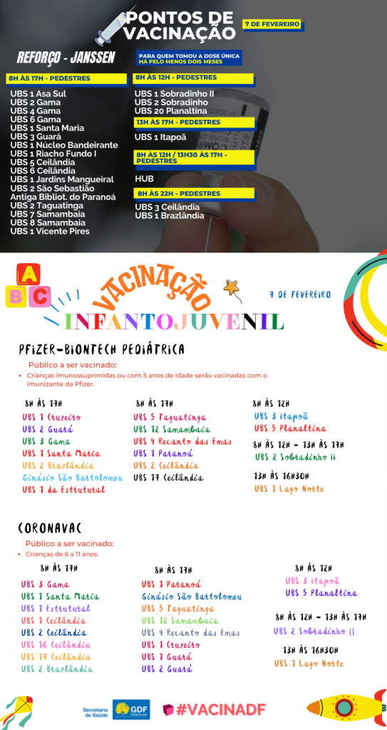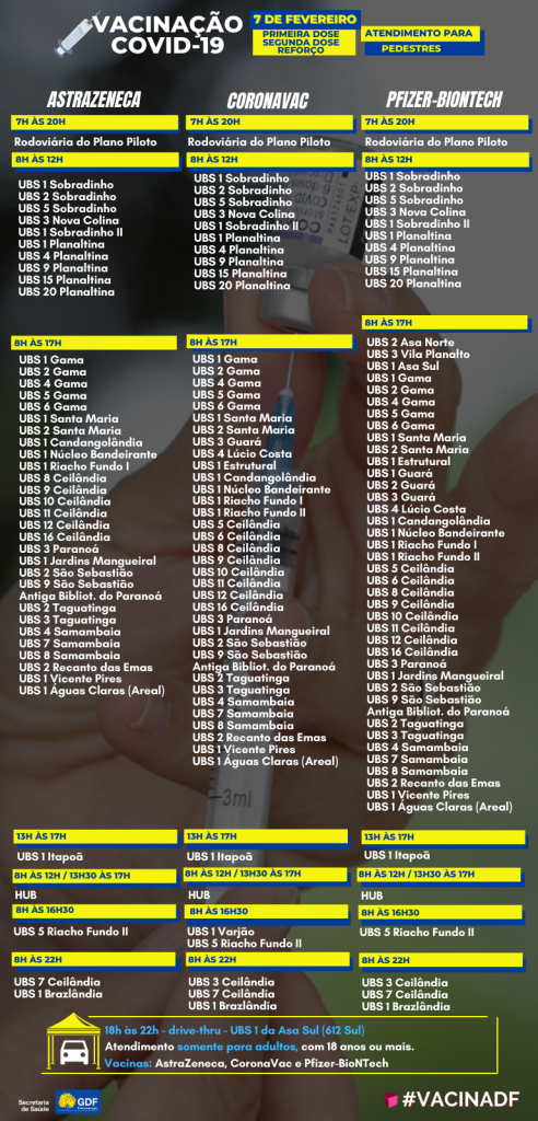 Nesta segunda-feira (7), o Distrito Federal contará com alguns postos de vacinação contra a covid-19. Crianças, adolescentes e adultos do Distrito Federal podem tomar a D1, D2 ou a dose de reforço. A aplicação de cada uma delas ocorre em locais específicos.