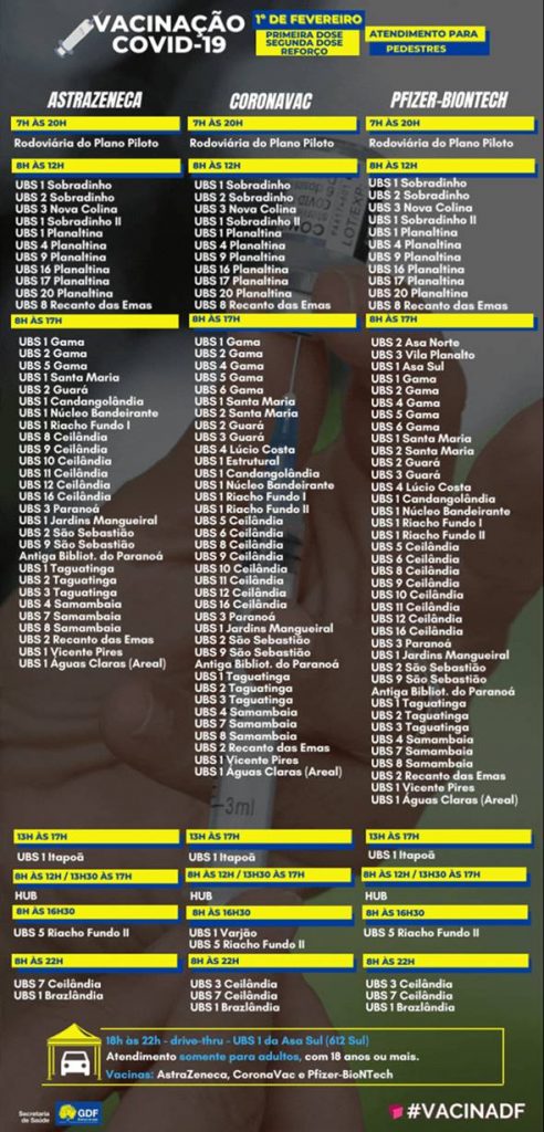 Nesta terça-feira (1º), o Distrito Federal contará com alguns postos de vacinação contra a covid-19. Crianças, adolescentes e adultos do Distrito Federal podem tomar a D1, D2 ou a dose de reforço. A aplicação de cada uma delas ocorre em locais específicos.