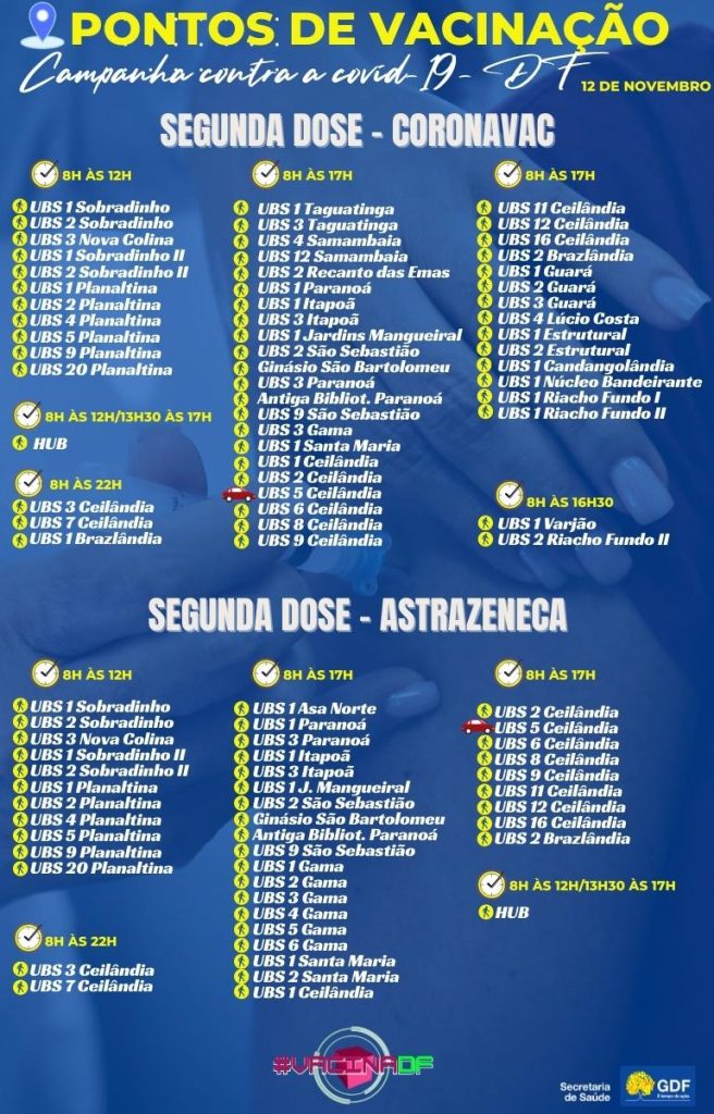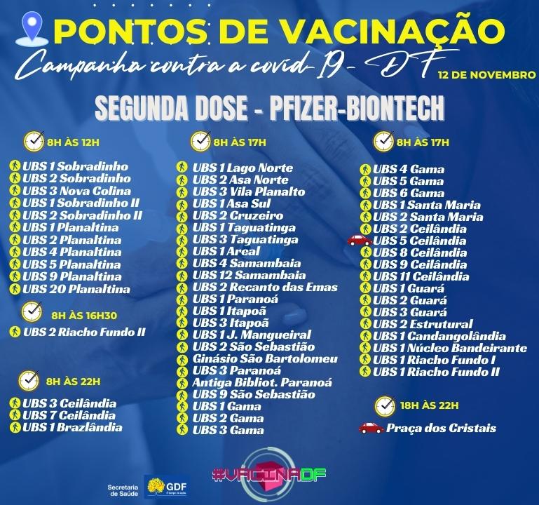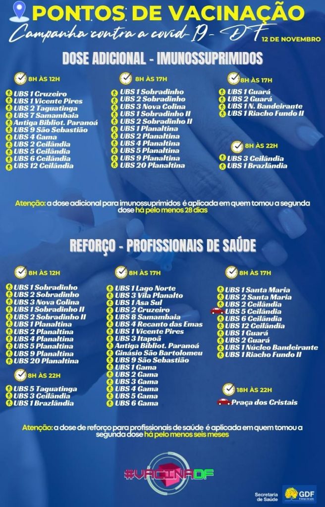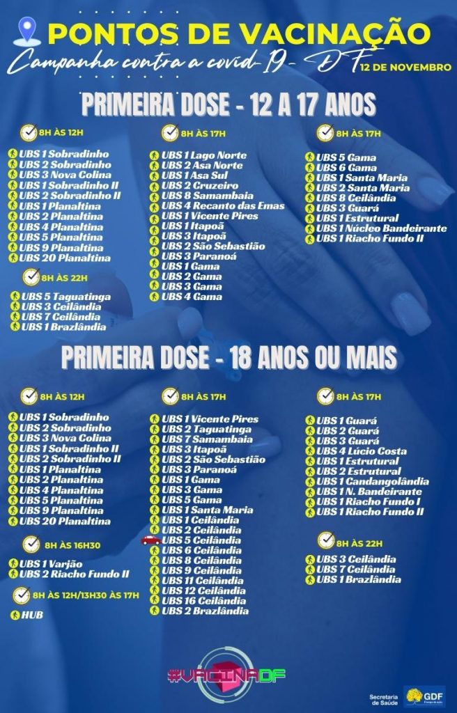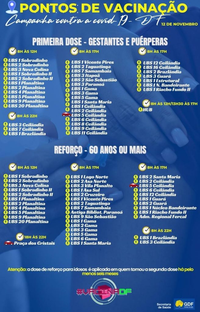 Nesta sexta-feira (12), diversos pontos de vacinação contra a covid-19 estarão abertos, alguns das 8h às 17h, outros até as 12h e outros até as 22h. Esses locais oferecem a aplicação da primeira dose para pessoas com 30 anos ou mais, gestantes e puérperas; e para quem se encontra no período devidamente indicado no cartão, a segunda dose.