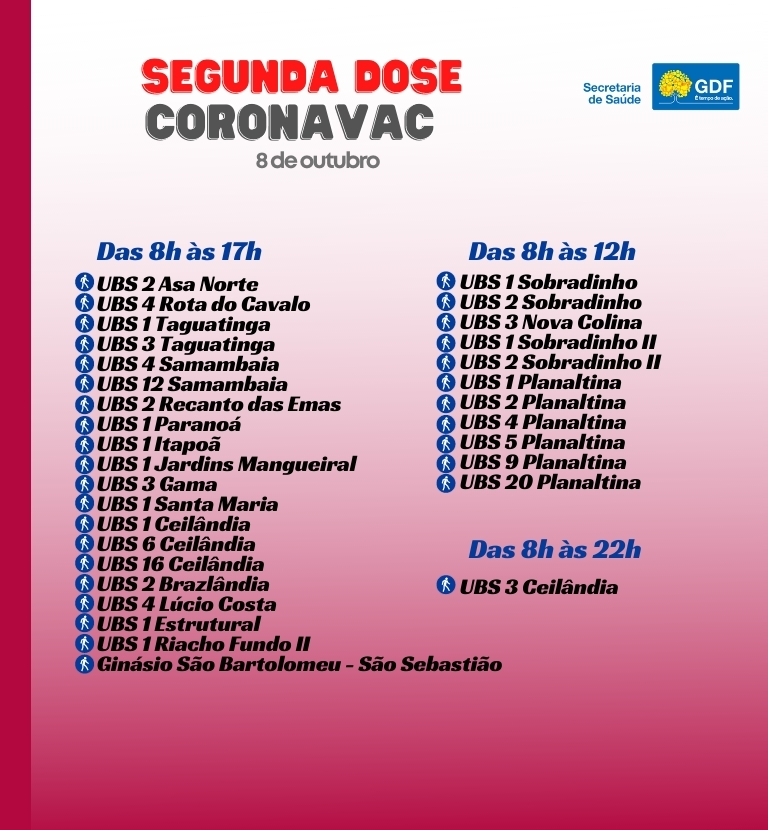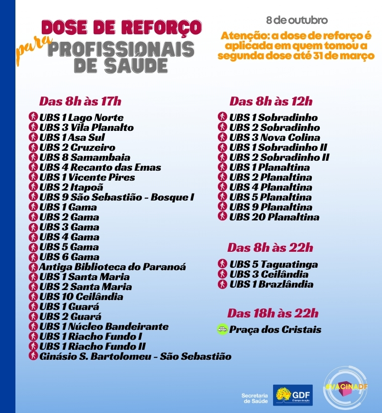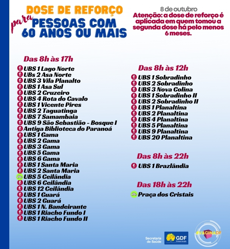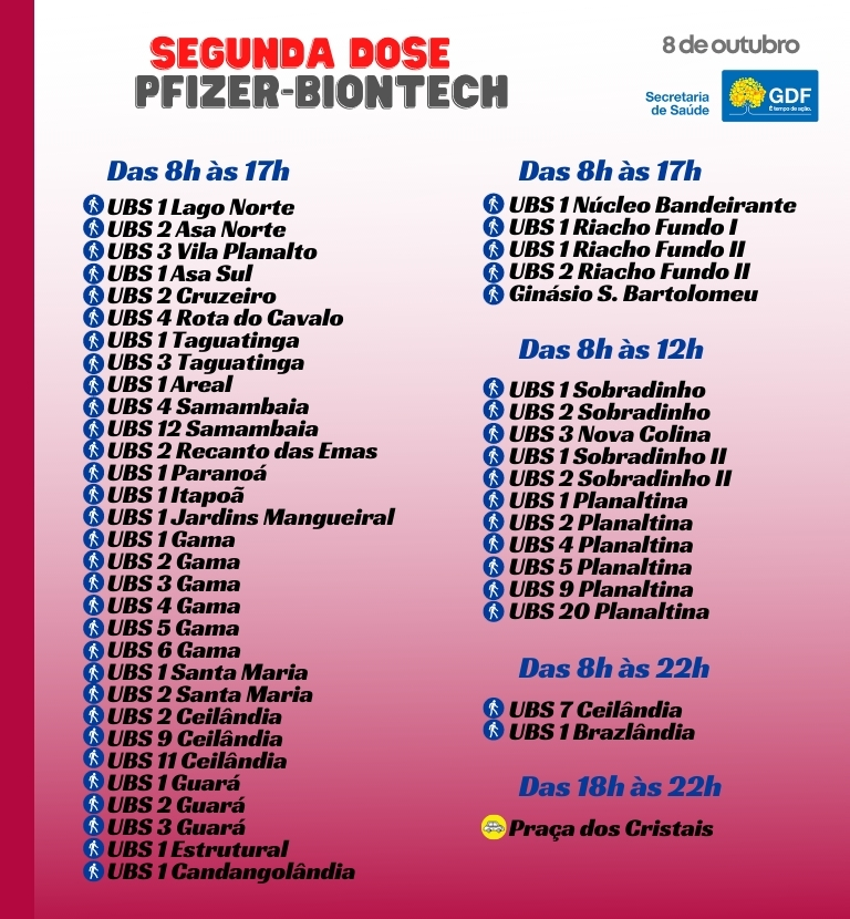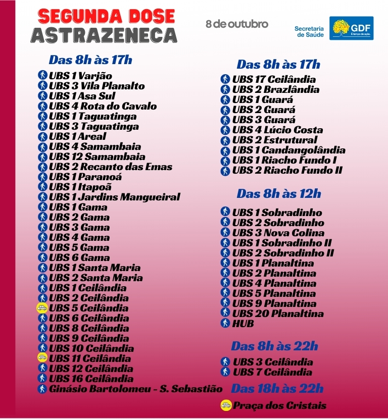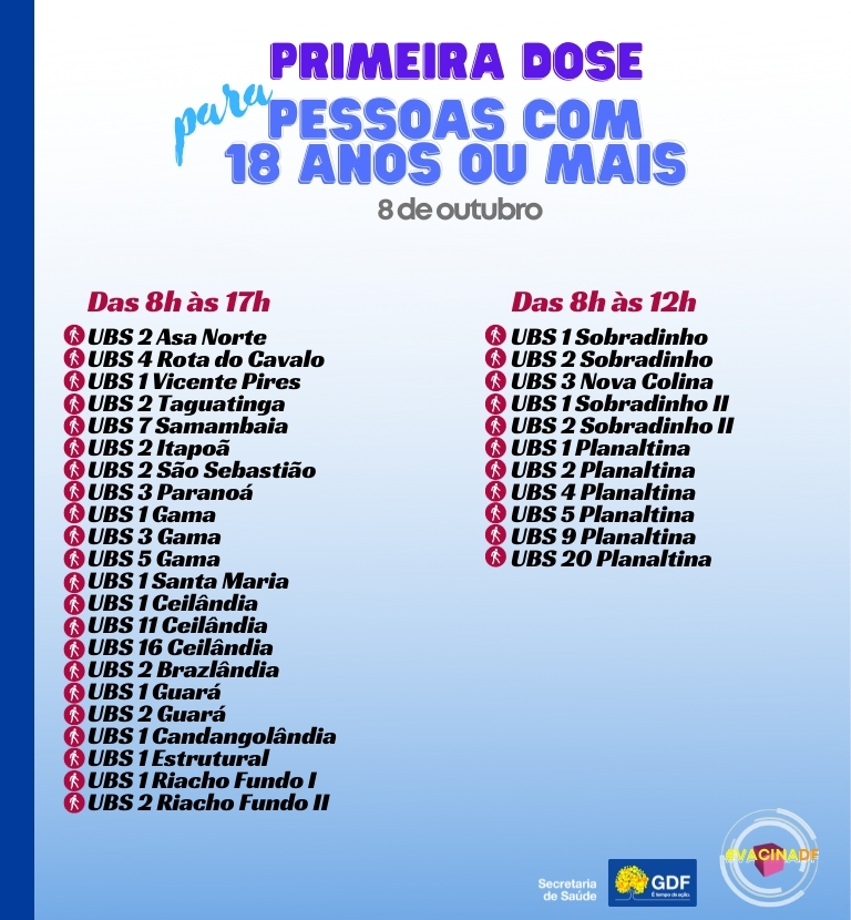 Nesta sexta-feira (8), sete pontos de vacinação contra a covid-19 estarão abertos, alguns das 8h às 17h, outros até as 12h e outros até as 22h. Esses locais oferecem a aplicação da primeira dose para pessoas com 30 anos ou mais, gestantes e puérperas; e para quem se encontra no período devidamente indicado no cartão, a segunda dose.
