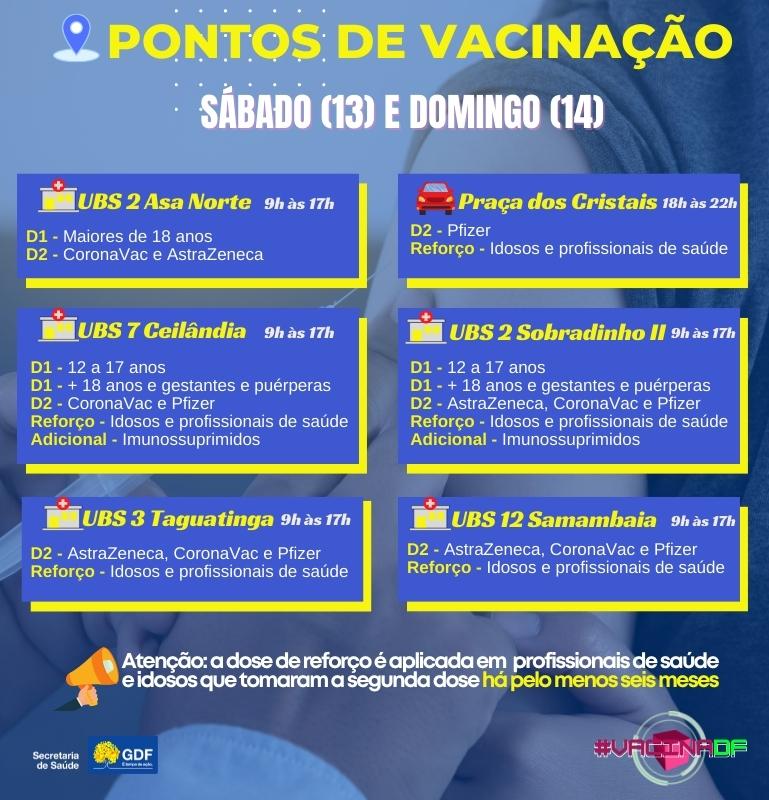 Neste fim de semana e na segunda-feira (15), diversos pontos de vacinação contra a covid-19 estarão abertos, alguns das 8h às 17h, outros até as 12h e outros até as 22h. Esses locais oferecem a aplicação da primeira dose para pessoas com 30 anos ou mais, gestantes e puérperas; e para quem se encontra no período devidamente indicado no cartão, a segunda dose.
