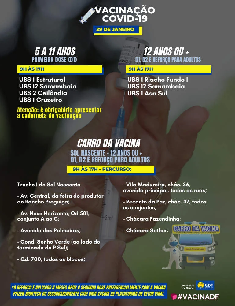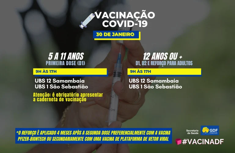 Neste sábado (29), o Distrito Federal contará com alguns postos de vacinação contra a covid-19.