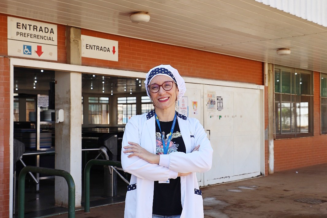 Karen atua há dois anos na unidade. Além de acompanhar as refeições – no local, são servidas 1,7 mil por dia –, ela é uma das responsáveis por montar os cardápios e fazer a fiscalização e controle dos alimentos: observa tudo que está armazenado e acompanha a produção das refeições.