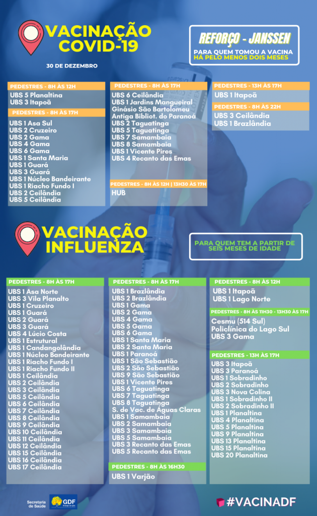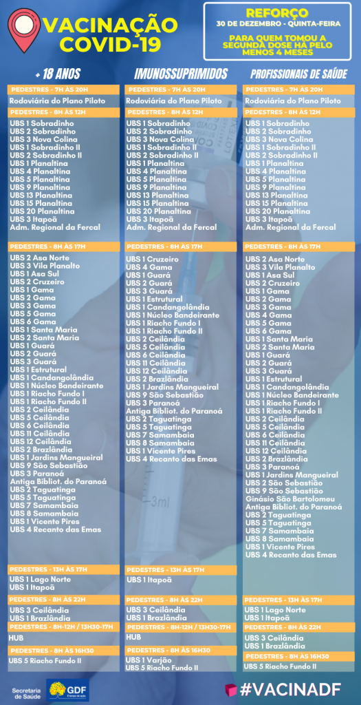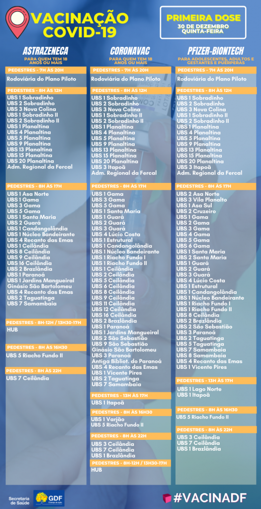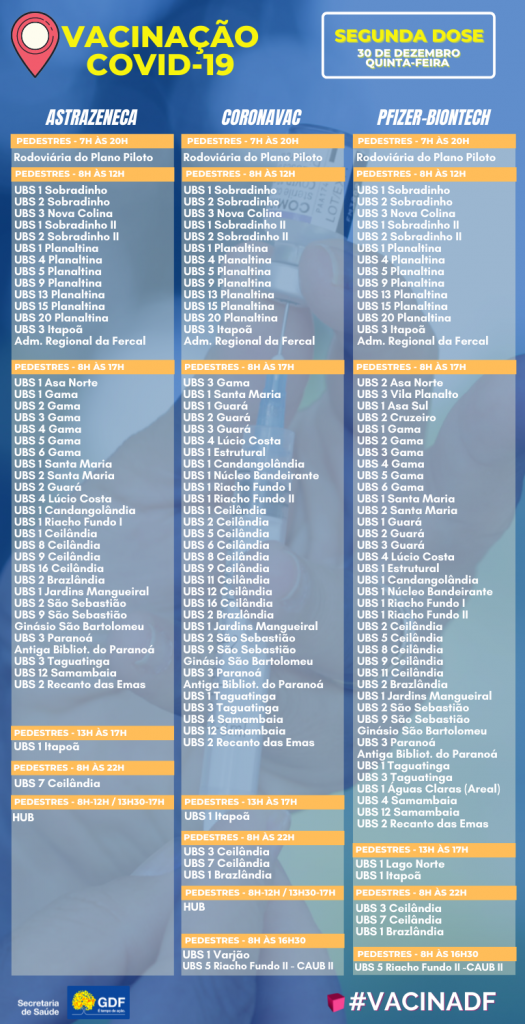 O GDF anunciou nesta quarta-feira (29), os dados dos boletins informativos sobre a vacinação no Distrito Federal, o documento revela o número de 2.305.855 vacinados da primeira dose, mais 2.072.173 pessoas que levaram a segunda dose, 58.390 da dose única e 379.658 da dose de reforço. Nas últimas 24h foram 705 vacinados da primeira dose, 4.699 da segunda dose e 14.925 da dose de reforço.