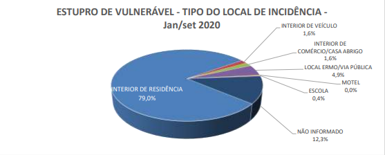 Dos 243 casos de estupro à vulneráveis notificados, 192 ocorreram dentro de residências, 12 em local ermo (solitário) ou via pública, 4 no interior de comércios ou casa abrigo, 4 no interior de veículos, 1 em escola e 30 não foram informados. A delegada explica que ao falar de abuso sexual contra vulneráveis é preciso tirar do imaginário o padrão de autor desconhecido em um lugar escuro. A vítima costuma ter uma relação de confiança, proximidade e afeto com o agressor.