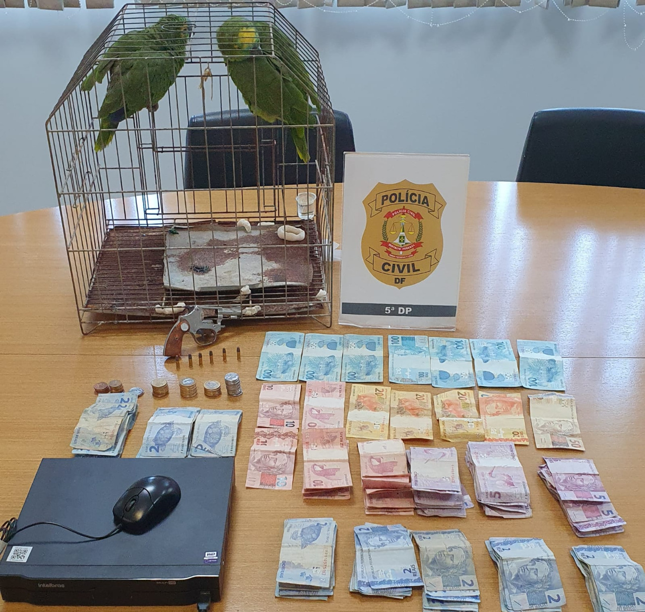 Na residência do investigado foi localizada uma arma de fogo, tipo revólver, calibre 22, com numeração suprimida, que estava carregada com seis munições intactas; grande quantidade em dinheiro; aparelhos celulares e dois papagaios-verdadeiros.