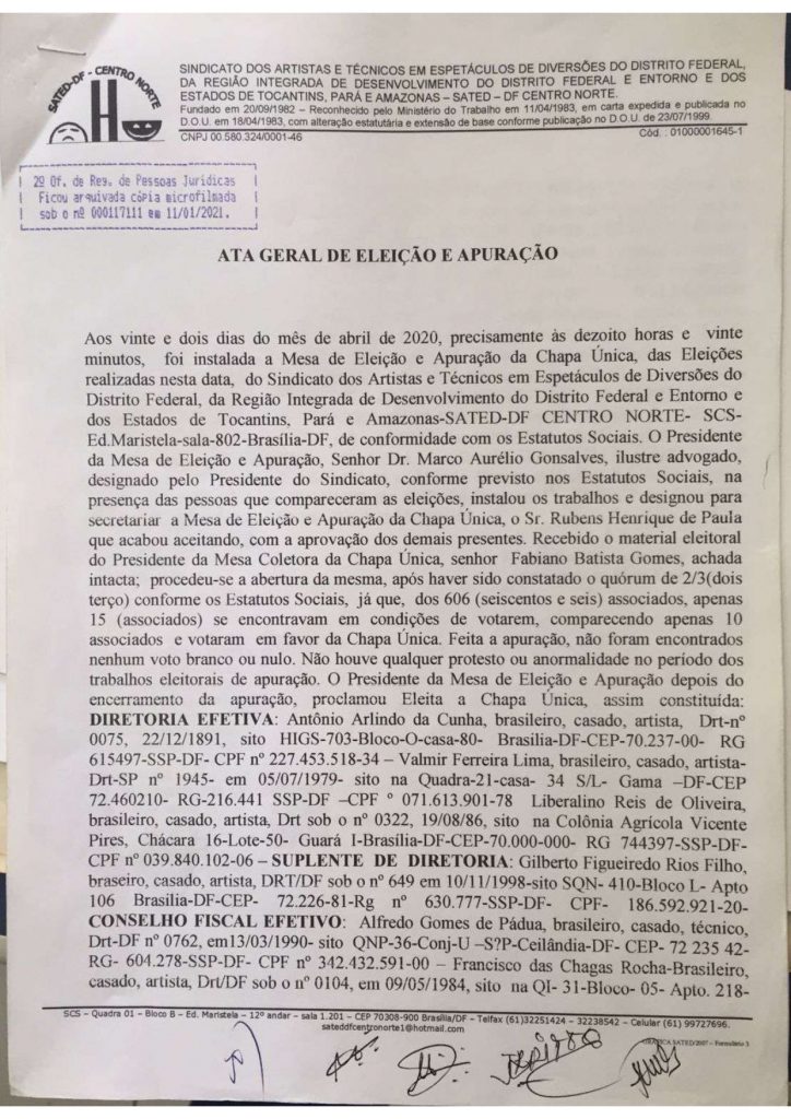 A Diretoria Efetiva vencedora foi composta de Antônio Arlindo da Cunha, Valmir Ferreira Lima e Liberalino Reis de Oliveira. Já como suplente de Diretoria surgia o nome de Gilberto Rios. Mesmo sem ele ter sequer ficado sabendo. “Declaro também que nunca recebi uma convocatória desta reunião e que não assinei nenhum documento neste sentido e se existe alguma assinatura que se faça apuração criminal e que no mês de agosto da minha estadia propus ao Sated a Banca de Capacitação Profissional na região deste Sated em função da necessidade do projeto da FBT, banca está que foi elaborada por uma parceria indicada do Paraná”, desabafou Rio, ainda na declaração por escrito.