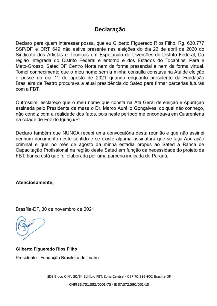 Na mesma afirmação feita escrita, Gilberto contou que soube com surpresa que seu nome constava como suplemente na chapa vencedora. “Tomei conhecimento que o meu nome sem a minha consulta constava na Ata de eleição e posse no dia 11 de agosto de 2021 quando enquanto presidente da Fundação Brasileira de Teatro procurava a atual presidência do Sated para firmar parcerias futuras com a FBT. Outrossim, esclareço que o meu nome que consta na Ata Geral de eleição e Apuração assinada pelo Presidente da Mesa Marco Aurélio Gonçalves, do qual não conheço, não condiz com a realidade dos fatos, pois neste período me encontrava em Quarentena na cidade de Foz do Iguaçu (PR)”, afirmou ele.