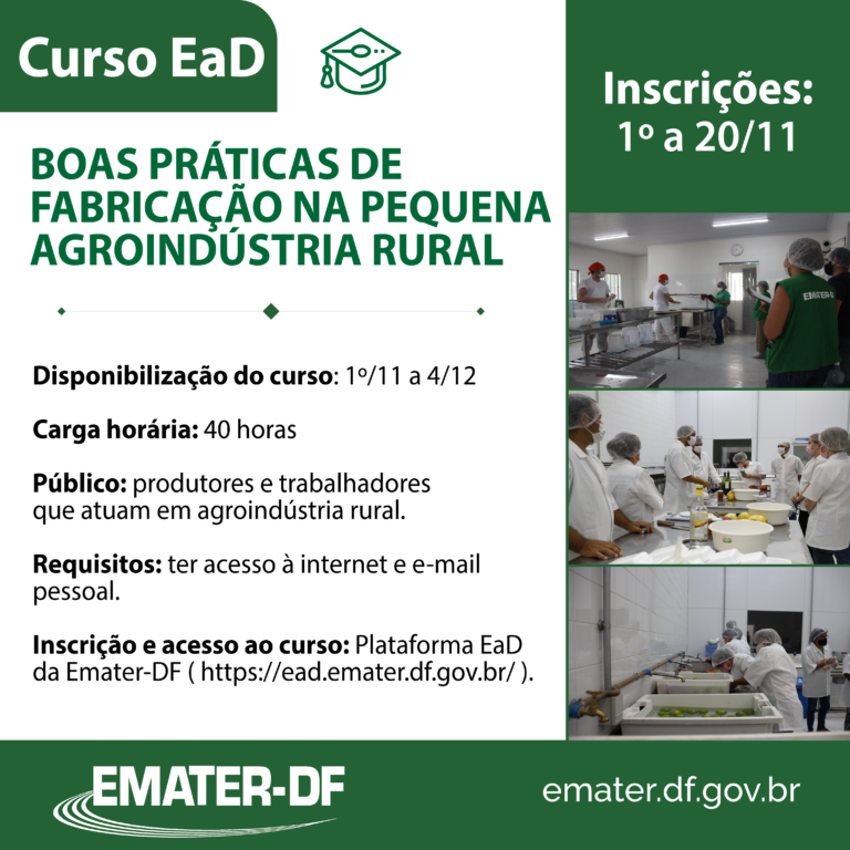 Vão até 20 de novembro as inscrições para o curso Boas Práticas de Fabricação na Pequena Agroindústria Rural. Já disponíveis na modalidade de ensino a distância, as aulas ficarão na plataforma EaD da Emater-DF até o dia 4 de dezembro. A atividade é gratuita e voltada para produtores e trabalhadores rurais que atuam em pequenas agroindústrias no Distrito Federal.