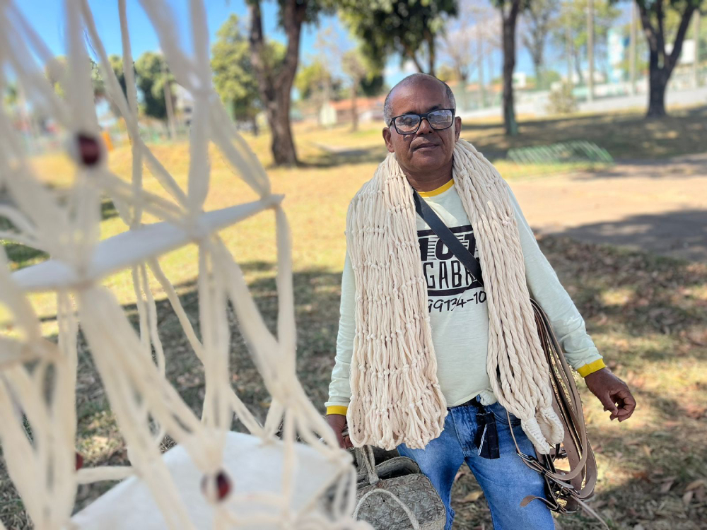 São redes e prateleiras feitas de algodão, bolsas confeccionadas com a palha da carnaúba e cintos de couro (“puro”, segundo ele). Tudo feito pelos parentes na Bahia. Para um homem de estatura baixa e magro, é um esforço e tanto. “Ainda mais embaixo desse sol quente e da secura aqui do Cerrado”, diz. Ele, no entanto, já encarou climas ainda mais árduos.