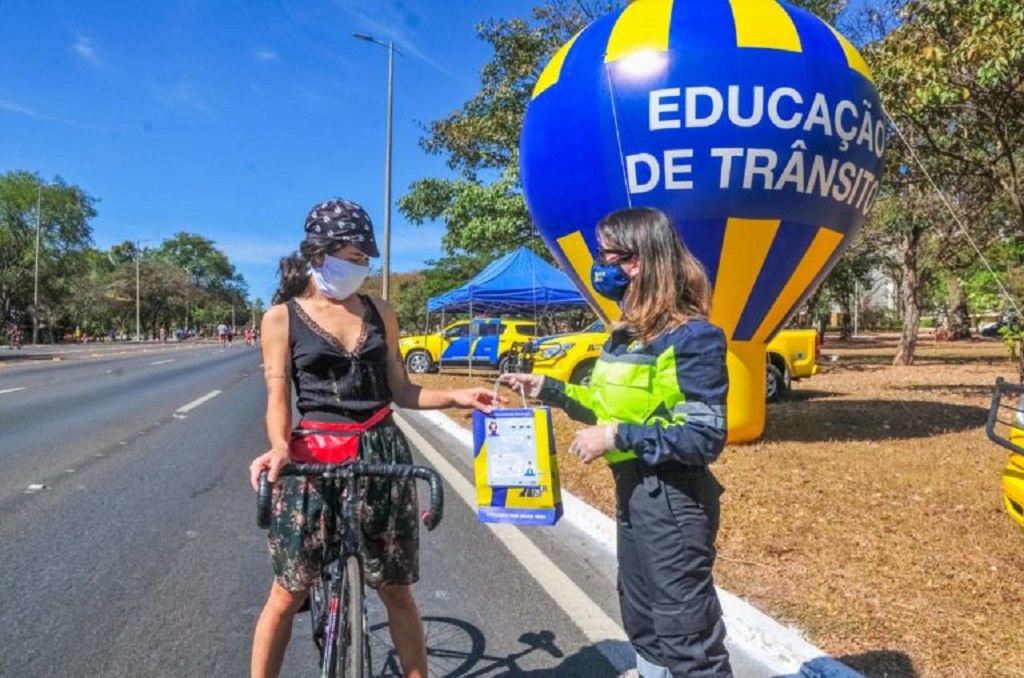 Agentes e analistas do Departamento de Estradas de Rodagem (DER-DF) foram ao Eixão para distribuir material educativo à população. O órgão aproveitou o Eixão do Lazer para falar aos pedestres e ciclistas como eles devem se comportar no trânsito. Os servidores também distribuíram máscaras para a proteção contra o coronavírus, confeccionadas pela Fábrica Social e doadas pela Secretaria de Governo.