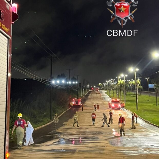Um derramamento de óleo provocou a interdição total da pista de ligação entre Samambaia e a QNL de Taguatinga, no Distrito Federal, na noite desta quinta-feira (26/02/2026). O Corpo de Bombeiros Militar do Distrito Federal foi acionado às 23h26 e mobilizou cinco viaturas para atender à ocorrência.