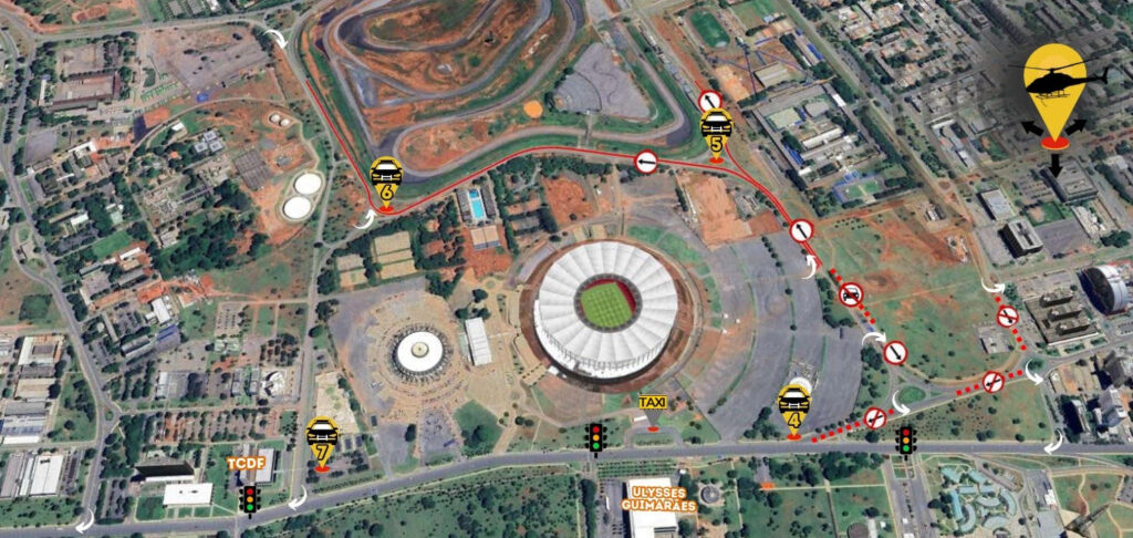 Na via N2, o acesso ao Eixo Monumental, na altura do estacionamento rotativo, será fechado. Na entrada principal da Arena BRB Mané Garrincha, haverá espaço reservado para táxis.