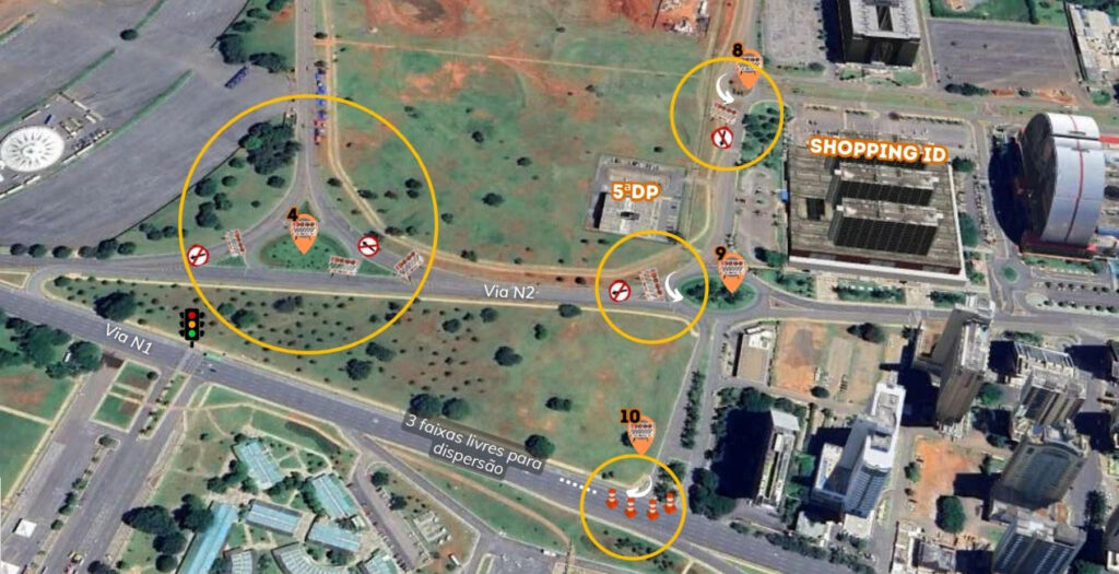 Na via N2, nas proximidades da rotatória da 5ª Delegacia de Polícia, haverá interdições para direcionar o fluxo à via N1. Sinalização será implantada na rotatória próxima ao shopping ID, orientando o tráfego para a via W3 Norte.
