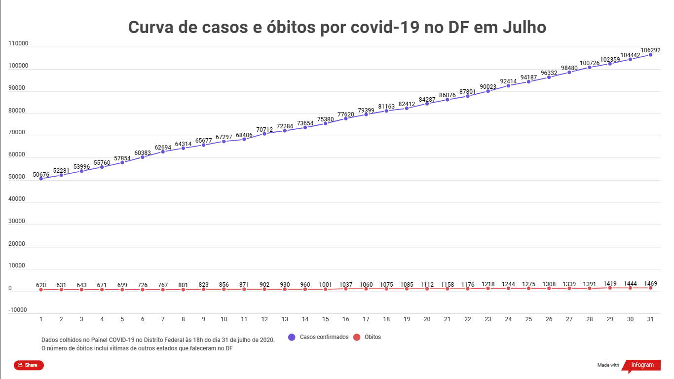 As cidades com mais casos confirmados são Ceilândia e Plano Piloto, com 13.208 e 8.382 casos, respectivamente. Entretanto, dos 106 mil contaminados, 88.797 estão recuperados, o equivalente a 83,5%. Nas últimas 24 horas, 2.007 foram registrados.