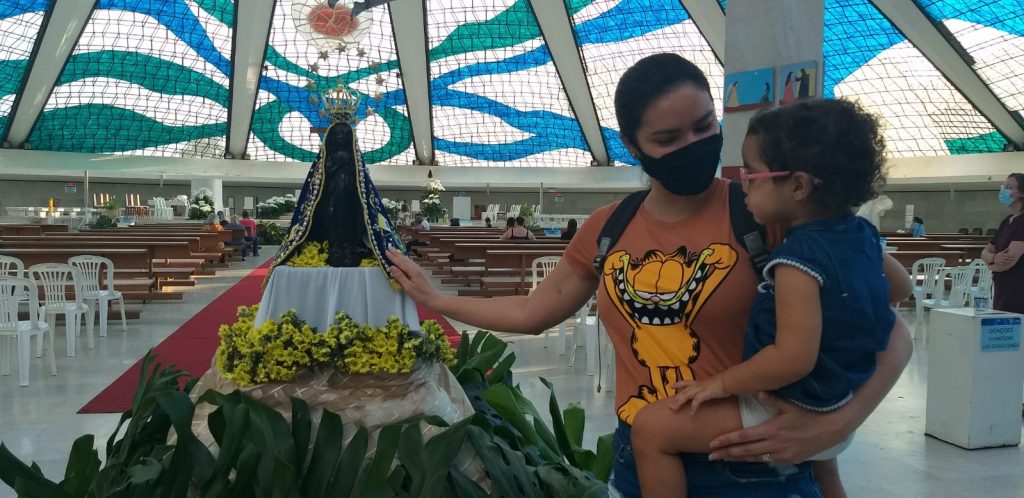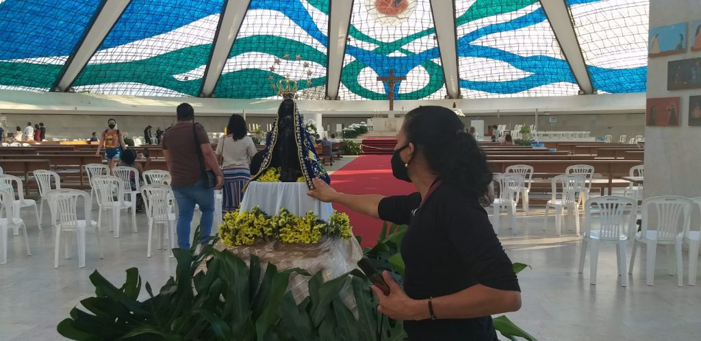 Com a aferição de temperatura na entrada e álcool em gel espalhado pelo ambiente, e responsáveis por manter todos de máscara, a Catedral de Brasília estava de portas abertas para celebrar o dia de Nossa Senhora Aparecida. As missas foram transmitidas nos canais da arquidiocese, mas a paróquia estava recebendo o público também.