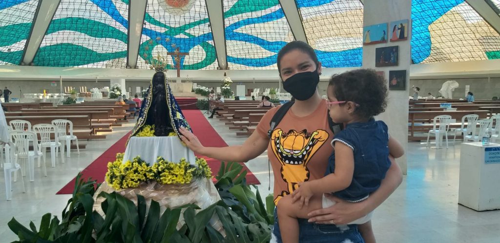 Quem também agradeceu a um pedido concedido, foi Erika Rodrigues de Almeida, 27, servidora pública. A filha Maria, batizada em nome da santa, está completando dois anos e foi promessa que pediu para Nossa Senhora. A criança estava presente com a mãe na celebração, ansiosa para ir brincar no parquinho, mas estava encantada com o teto da paróquia, dizendo que havia baleias nele que estavam perto de Deus. Erika é bem cautelosa quanto a pandemia, ainda mais por trabalhar no ministério da saúde, então ela esperou a movimentação diminuir para poder presenciar o dia de Nossa Senhora Aparecida.