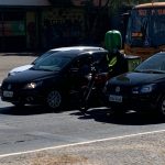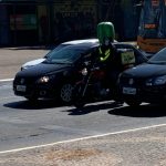 Nesta manhã, os brasilienses foram surpreendidos com um motociclista chamado atenção no trânsito. Ele estava literalmente com uma melancia na cabeça, um colete fosforescente e um adesivo que dizia: “Hoje você me viu?”.