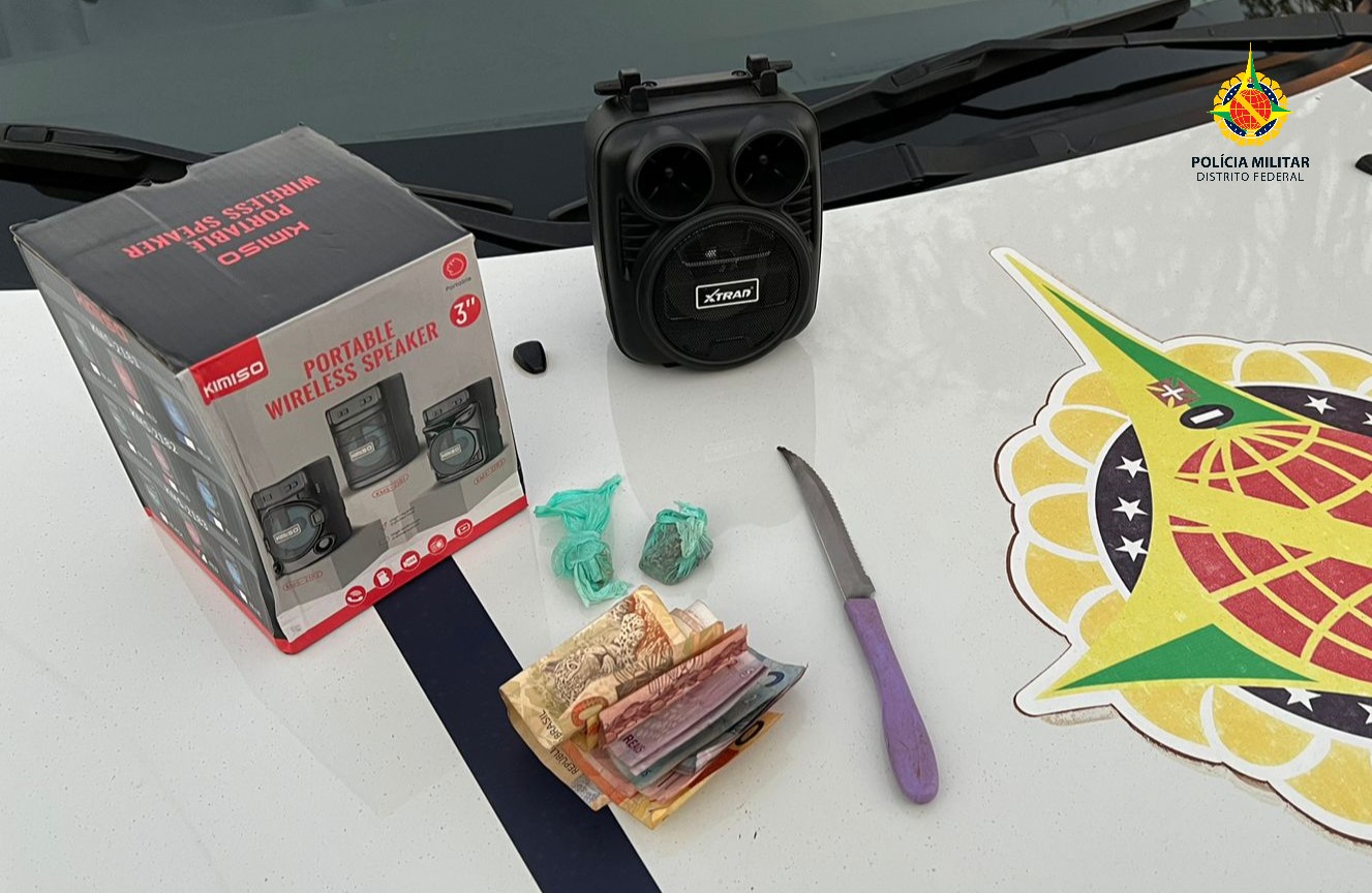 Dentre os objetos apreendidos, havia uma caixa de som portátil de procedência desconhecida, uma pequena faca de serra, além de R$ 102,00 em dinheiro. Os policiais também localizaram uma porção de maconha e outra de crack, que estavam escondidas na alça de uma mochila.